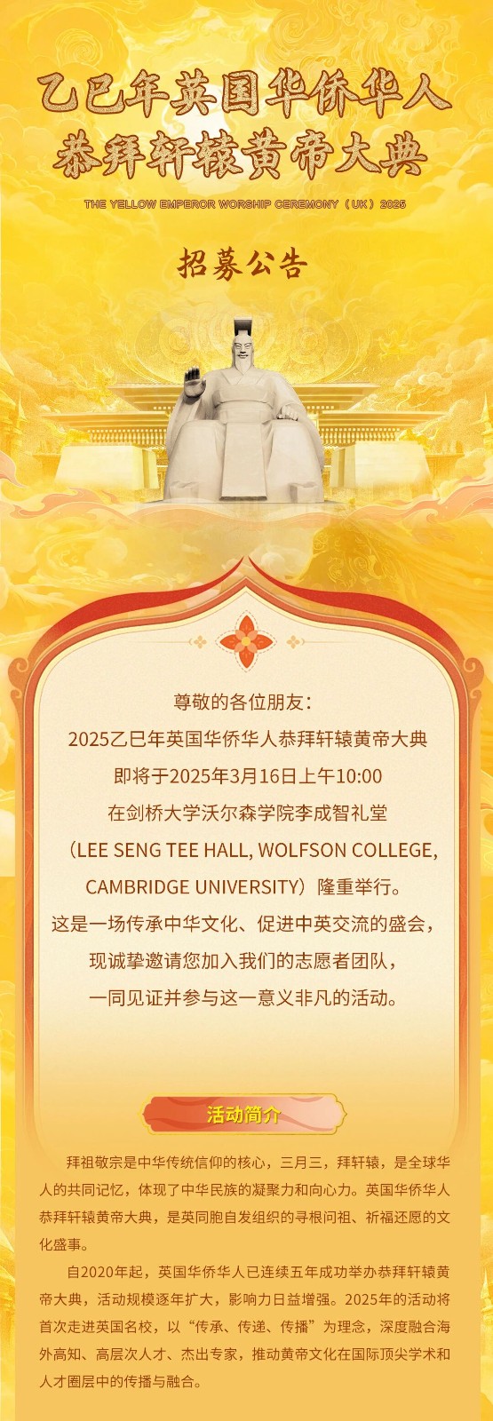 Recruitment Announcement for the 2025 (Year of the Snake) British Overseas Chinese Ceremony to Worship the Yellow Emperor